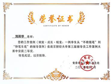 刘英华的工作案例《赋能·成长·蜕变:一例学生从“不敢提笔”到“妙笔生花”的辅导案例》荣获二等奖。该案例聚焦学生学习发展中的核心痛点,通过精准施策、持续引导,帮助学生突破心理与能力双重障碍,生动诠释了"以生为本、因材施教"的育人理念。