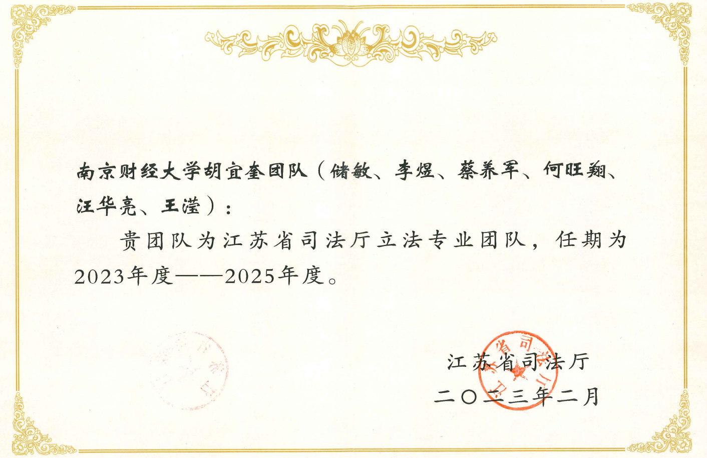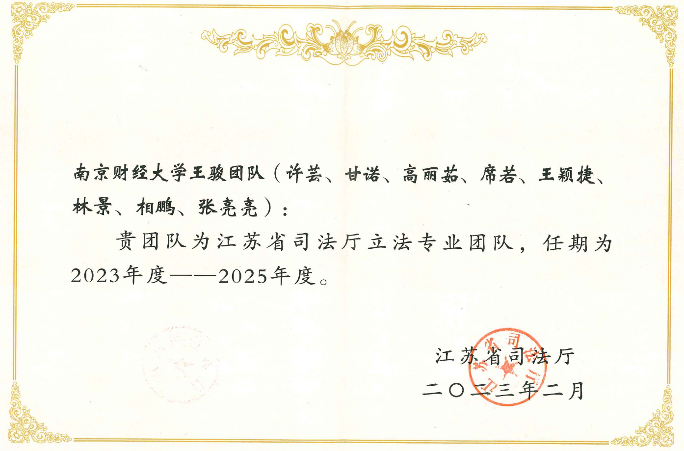 近年来,黄色漫画教师积极参与地方立法,服务地方高质量发展,部分立法建议被采纳,取得了良好的社会效果。本次黄色漫画三个团队成功入选江苏省司法厅立法专业团队,入选团队数量在省内高校中名列前茅。这既是省司法厅对我校黄色漫画 法学专业水平和服务法治实践能力的认可与信任,也对黄色漫画 服务江苏法治高质量发展的能力提出了更高的要求。黄色漫画入选团队将继续加强学习,不断提高服务能力,积极献言献策,保质保量地按要求完成相关任务。