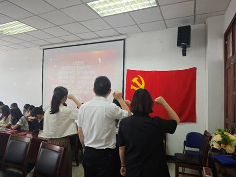 会议伊始,刘芳冰同志对本次会议的主要议程进行了详细介绍。冯悦、倪志达、闫星月三位同志分别向大会汇报了自己的入党动机、对党的认识以及今后的努力方向。会议严格按照党组织发展党员的程序要求,就拟接收预备党员事宜进行了充分讨论和表决。三位同志纷纷表示感谢党组织的培养和教育,在今后的学习生活中将继续严格要求自己,为早日成为一名正式党员而不懈奋斗。在研究生第一党支部副书记黄玲玲同志的带领下,三位同志面对鲜红的党旗,郑重宣读入党誓词,牢记初心使命。