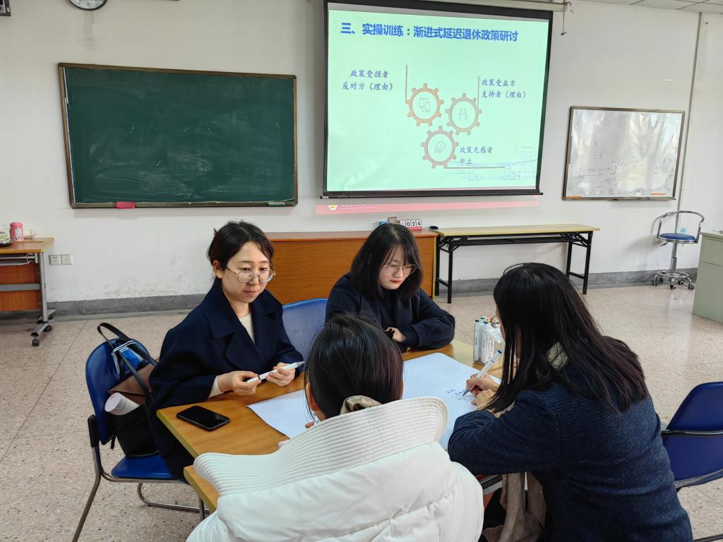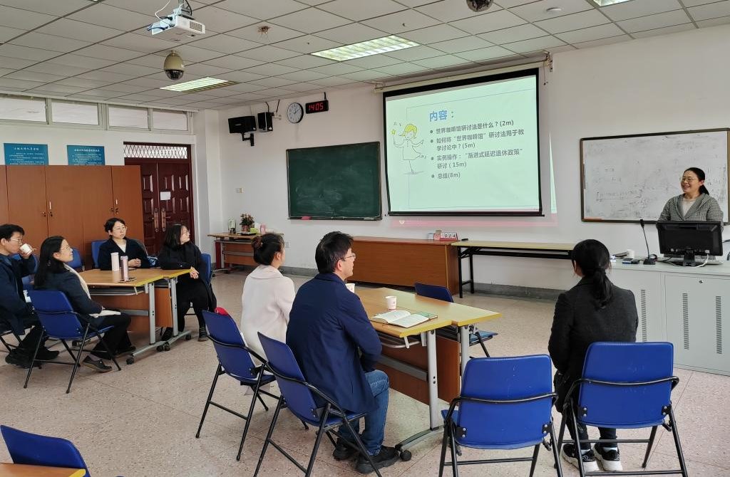 许芸主任以此为主题作了精心准备,在研讨环境布置上,准备了咖啡、花茶和点心。在课程安排上,将参与的老师们分为两个小组,首先是通过暖身游戏,让参与者放松并醒脑;接着详细介绍了世界咖啡馆研讨法的内涵,运用世界咖啡馆研讨法的操作步骤和方法,并通过平时社会政策课堂中的案例进行了解说;接着,她引导参与的老师们以“延迟退休政策”为例,运用世界咖啡馆研讨法进行了实操训练。
