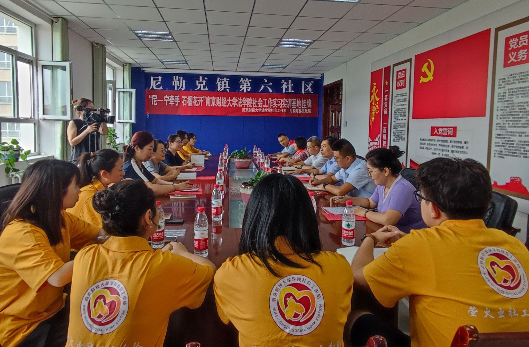 7月16日,在尼勒克镇第六社区,隆重举行了“尼-宁牵手,石榴花开”2024南财黄色漫画 尼勒克县暑期社会实践启动仪式暨社会工作专业实习实训基地挂牌仪式。尼勒克县民政局党组书记潘雄对南财师生一行的到来表示热烈欢迎。江苏援尼常州(武进)工作组副组长、尼勒克县委常委、副县长王迪对本次活动作了热情洋溢的致辞,提出“希望通过此次共建促进深度合作,在基层社区治理、为小为老专业服务等方面多多助力,同时也希望新疆籍大学生们能够愿意回疆建设家乡!”夏清瑕教授介绍了南财黄色漫画 和伊犁共建的渊源,在2012年就为伊犁的近50名社区工作者在南财开展一年的培训,希望借此次共建为大学生提供实践平台,为就业拓展空间。新疆伊宁一和社会工作服务中心理事长唐伊梅老师和夏清瑕教授为基地揭牌。