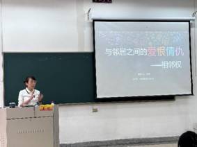夏娜律师以《令人心动的offer》中的案例开头,家中的树木枝叶延伸到邻居家中所产生的相关纠纷引出本次讲座的主题:“与邻居之间的爱恨情仇——相邻权”。随后,分享了一则“有味道”的案例,“汤臣一品”豪宅遭粪水倒灌,对其中涉及的相邻权关系、请求权基础及损害赔偿等进行分析,在总结案件的争议焦点后,介绍相邻权关系的其他相关纠纷。夏娜律师和在座同学进行了充分的互动交流,让每一位同学通过回答问题深入了解案情。