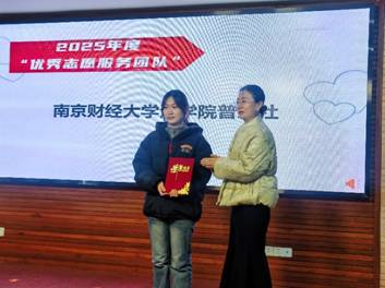 表彰仪式上,普爱社共有十位社员荣获“优秀志愿者”称号,他们以实际行动诠释了当代大学生的责任与担当。副社长顾涵玥代表社团登台领取“优秀志愿服务团队”奖项,标志着社团整体工作获得高度认可。随后,副社长苟立鹏作为优秀志愿者代表发言,分享了他参与街头救助服务的感悟与成长;社长王莹则代表优秀志愿服务团队发言,回顾了社团与南京市救助管理站长期合作的历程与收获。