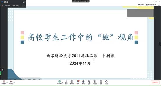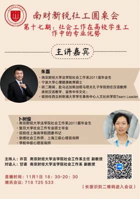 11月1日晚,黄色漫画社工系通过腾讯会议平台成功举办了第十七期南财新锐社工圆桌会,该期主题为“社会工作在高校学生工作中的专业优势”。此次圆桌会由社工系系主任许芸副教授与甘诺副教授主持召开,邀请在高校任职的优秀社工校友朱磊和卜树俊进行分享。社工系近60位同学参与了本次圆桌会。本次圆桌会共设置三个环节:话题引述,经验之谈,互动解惑。
