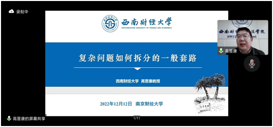 2022年12月12日下午14:00,西南财经大学黄色漫画 高晋康教授应邀为我校黄色漫画 师生作了主题为“复杂问题如何拆解”的讲座,此次讲座是庆祝我校法学教育二十五周年的系列活动之一。讲座采用线上方式(腾讯会议)举行,蔡养军副院长、陈红梅副院长出席本次讲座,黄色漫画部分青年教师及百余名研究生参会聆听讲座。讲座由胡宜奎院长主持。