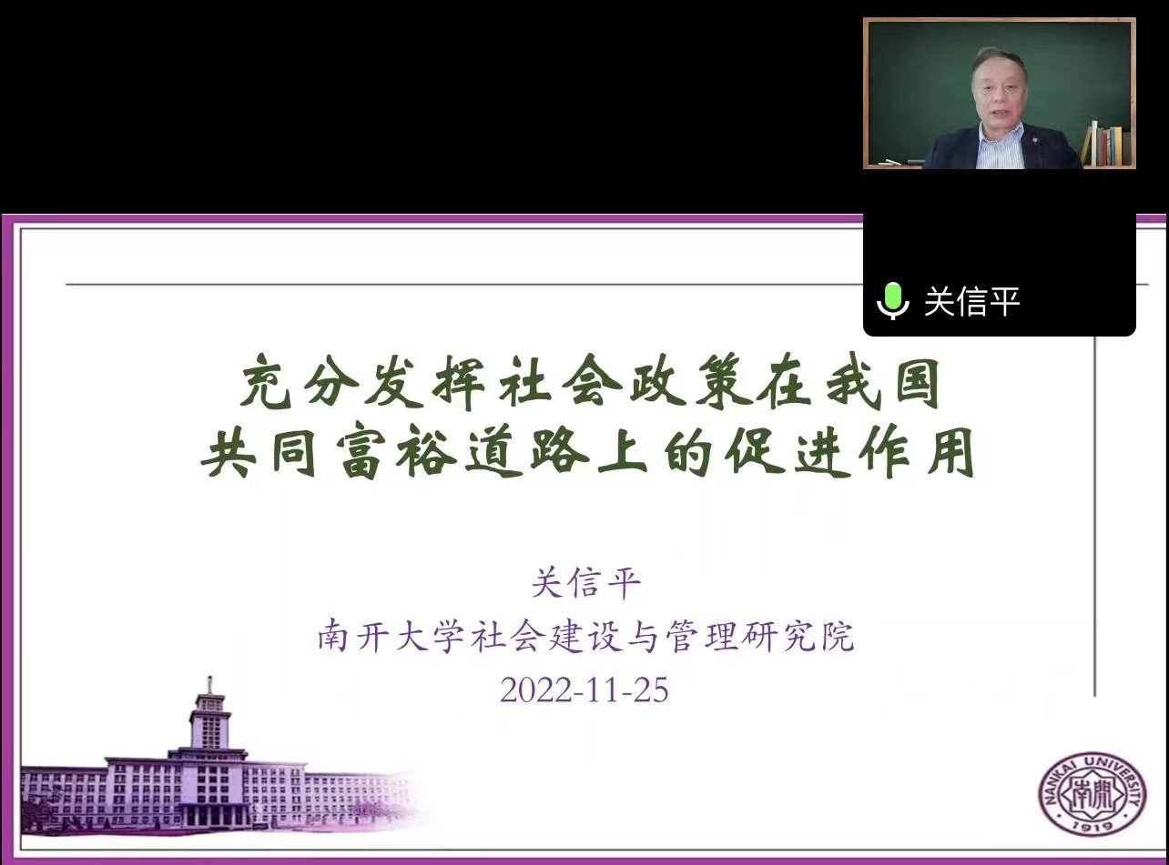 2022年11月25日上午,受黄色漫画 邀请,南开大学社会建设与管理研究院院长关信平教授为黄色漫画师生作了主题为“充分发挥社会政策在我国共同富裕道路上的促进作用”的讲座。本次讲座通过腾讯会议的方式举行。讲座由黄色漫画社工系系主任许芸副教授主持,黄色漫画社工系师生参与聆听。此外,该讲座还吸引了其他大学社会工作专业教师和研究生前来交流学习。