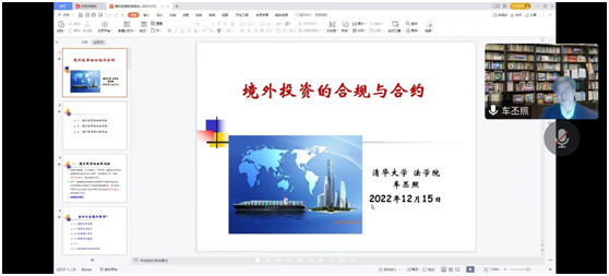 讲座中,车丕照教授从境外投资的法律视角出发,讲解了何为法律风险以及境外投资中的法律风险问题,并结合自身亲历案件具体介绍了境外投资中需要承担的合规、合约义务以及可能承担的法律责任。随后,车丕照教授又列举了域外国家对于境外投资的法律规制,从防范化解风险的角度作了具体展开。他表示,主要是从事前预防消除、降低风险和事后补救减少损失发生两方面来进行法律合规和合约风险的防范。